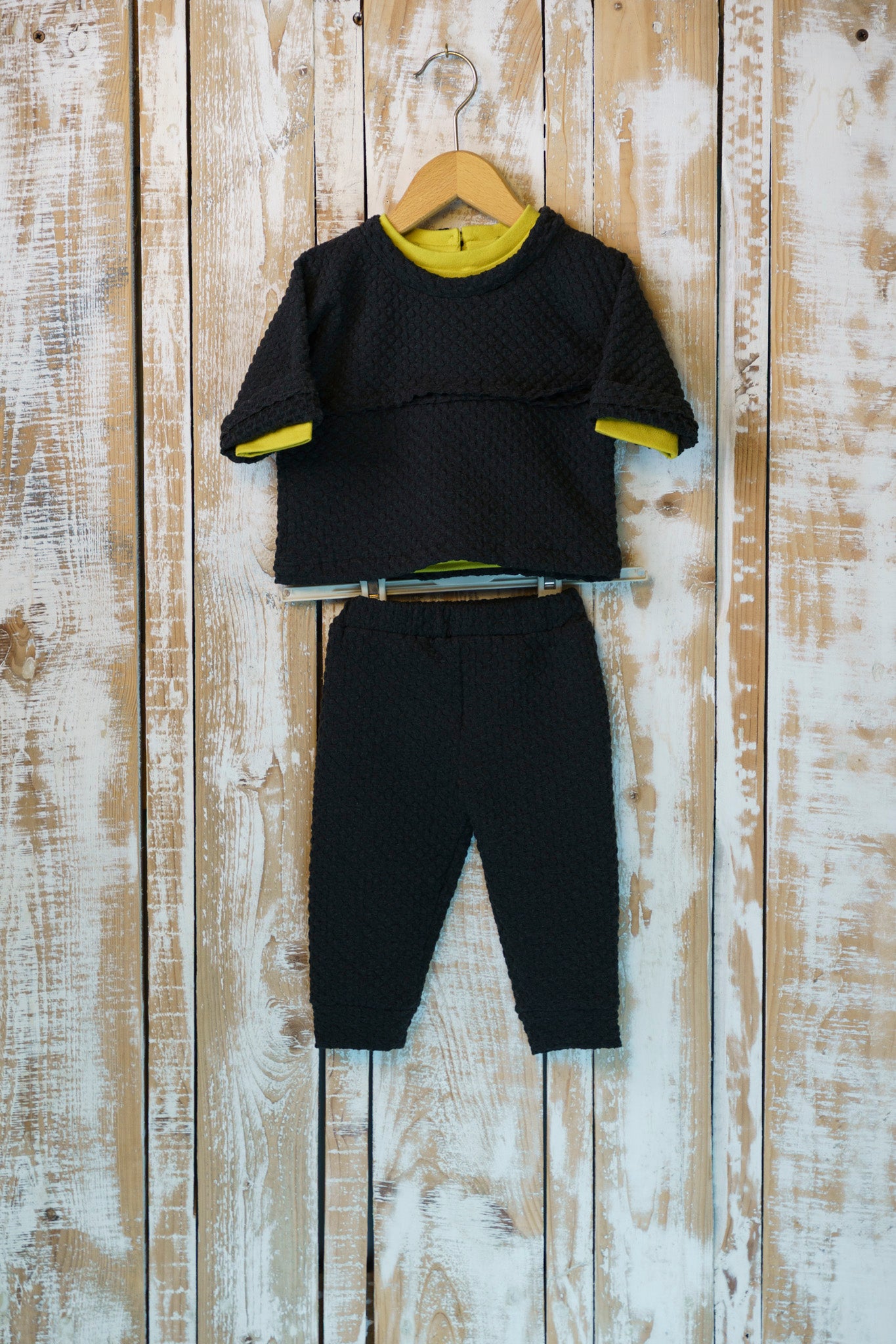 Il completo tuta è stato realizzato pensando alla comodità del tuo bambino, ideale per il giorno. Realizzato con materiali traspiranti, offre una vestibilità confortevole per ogni momento, Il tessuto è lavorato con texture a bolle e dona un tocco allegro, perfetto per un look pratico.